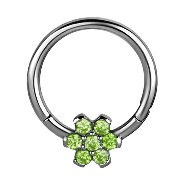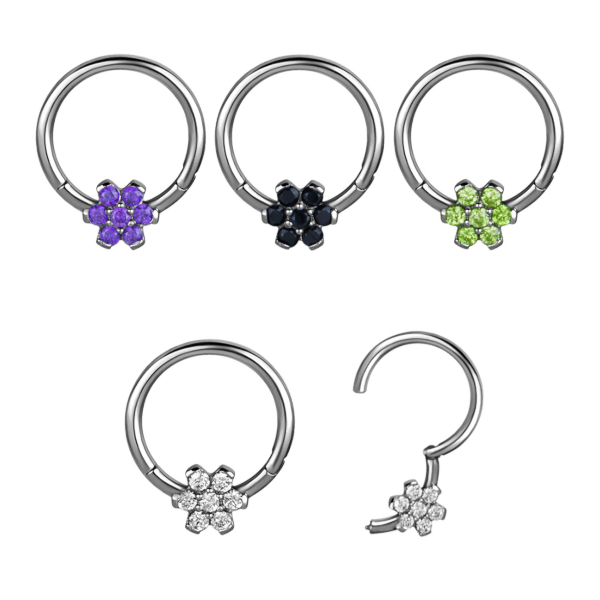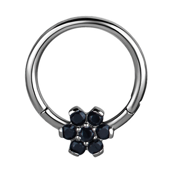 Кликер из хирургической стали 316L украшен цветком из фианитов. Диаметр цветка - 5,5 мм.