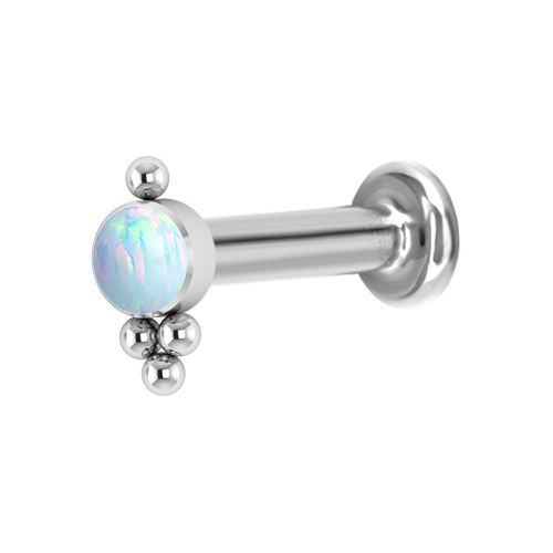 Лабрет из имплантационного титана 6Al-4V-Eli ASTM: F-136 с внутренней резьбой. Украшен искусственным опалом диаметром 3 мм.