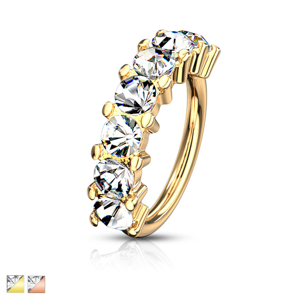Раздвижное кольцо из хирургической стали 316L с PVD покрытием жёлтого и розового золота украшено прозрачными кристаллами.