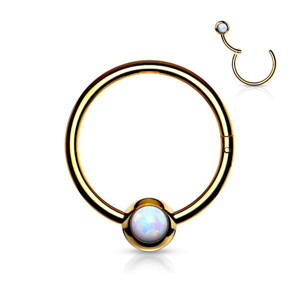 Кольцо из хирургической стали 316L с шариком, украшенным синтетическим опалом. Золотое PVD покрытие.