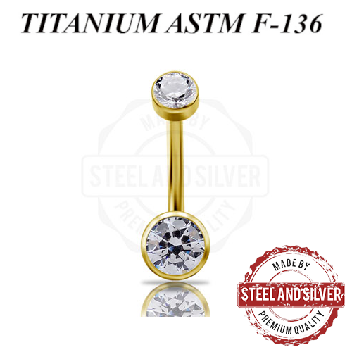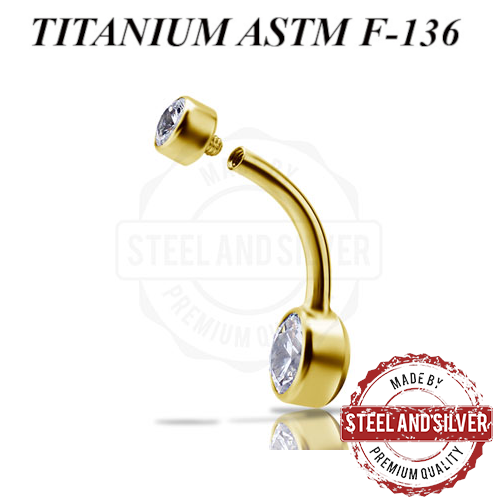 Банан с внутренней резьбой из имплантационного титана 6Al-4V-Eli ASTM: F-136 с PVD покрытием 24х каратного золота. Украшен кристаллами Premium Zirconia размерами 4 и 6мм.