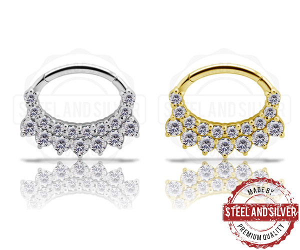 Кликер из хирургической стали 316L с кристаллами Premium Zirconia. Представлены две вариации: классический стальной и с золотым 24х каратным PVD покрытием.