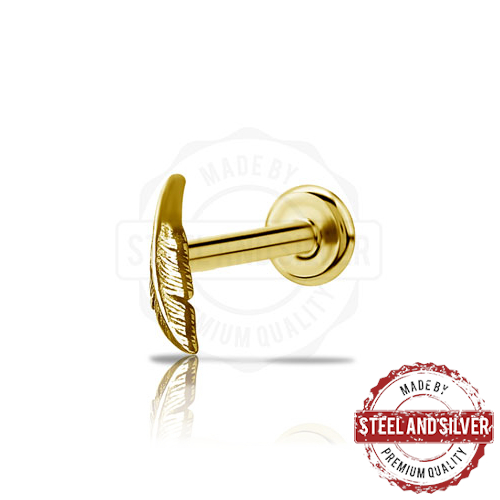 Лабрет с внутренней резьбой из хирургической стали 316L с 24х каратным золотым PVD покрытием. Украшен накруткой в форме пера. Размер декоративной части: 3х7,7мм.