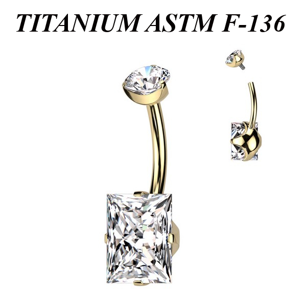 Банан с внутренней резьбой из имплантационного титана 6Al-4V-Eli ASTM: F-136 с золотым PVD покрытием. Украшен крупным прямоугольным кристаллом. Размер кристалла: 8х10мм.
