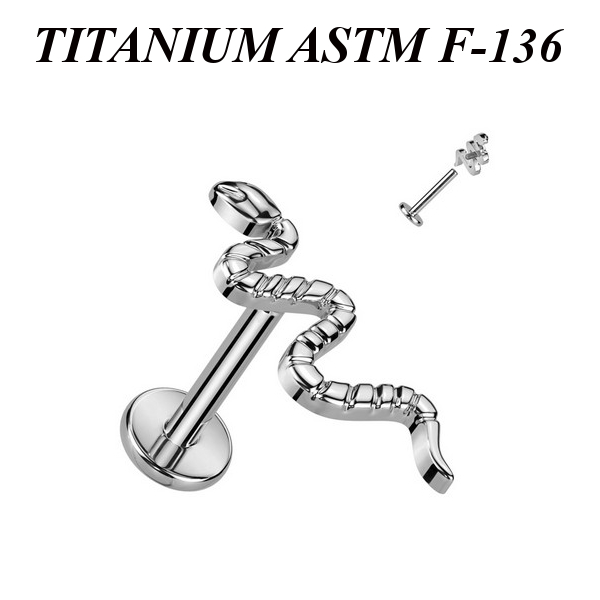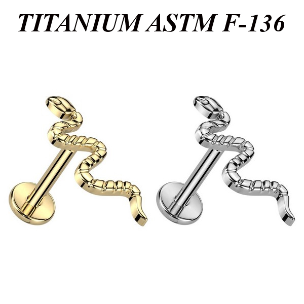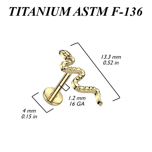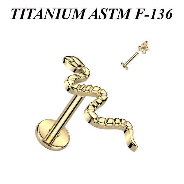 Лабрет из имплантационного титана 6Al-4V-Eli ASTM: F-136 с внутренней резьбой. Представлен в двух вариантах: классический титановый и с золотым PVD покрытием. Украшен накруткой в форме змеи. Размер накрутки: 4,5х13,5мм.