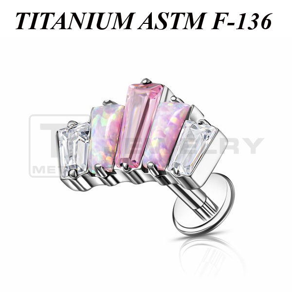 Лабрет из имплантационного титана 6Al-4V-Eli ASTM: F-136 с внутренней резьбой. Украшен кластером с лабораторными опалами и многоцветными фианитами. Размер декоративной части: 10х6мм.