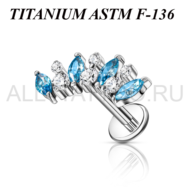 Лабрет с внутренней резьбой из имплантационного титана 6Al-4V-Eli ASTM: F-136. Украшен кластером с голубыми и прозрачными фианитами. Размер кластера: 12х5мм.