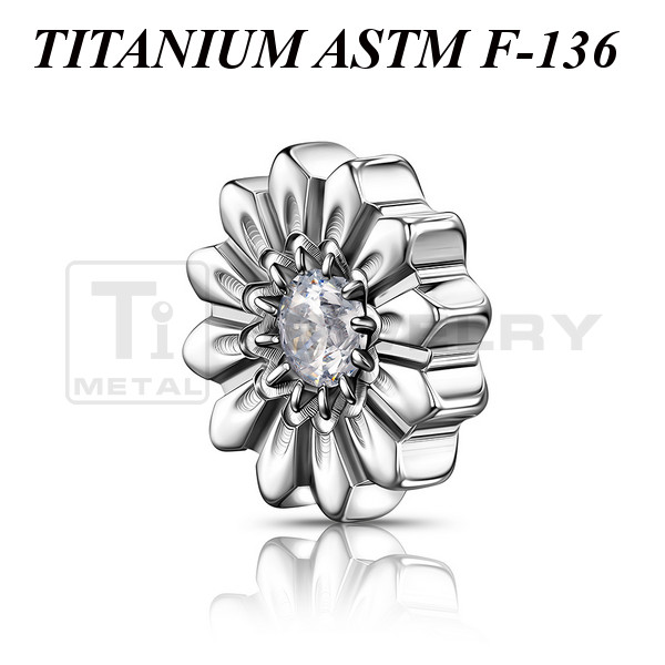 Фигурная накрутка из имплантационного титана 6Al-4V-Eli ASTM: F-136 в форме цветка. Украшена прозрачным фианитом. Подходит для украшений с внутренней резьбой толщиной 1 и 1,2 мм.