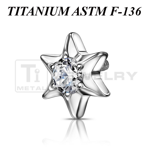 Накрутка из имплантационного титана 6Al-4V-Eli ASTM: F-136 в форме шестиконечной звезды с прозрачным фианитом. Подходит для украшений с внутренней резьбой толщиной 1 и 1,2 мм.