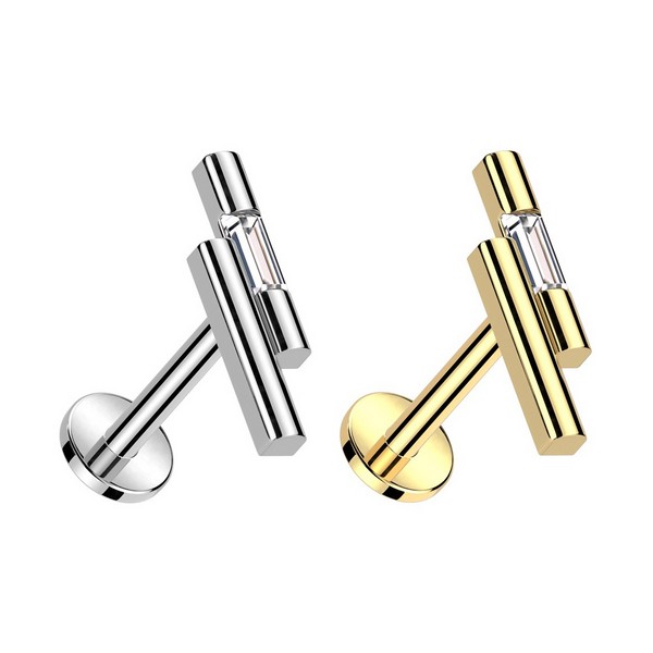 Безрезьбовой лабрет из хирургической стали 316L со вставкой из родированной латуни, украшенной прозрачным фианитом огранки "багет". Представлен в двух вариантах: классический стальной и с золотым PVD покрытием.