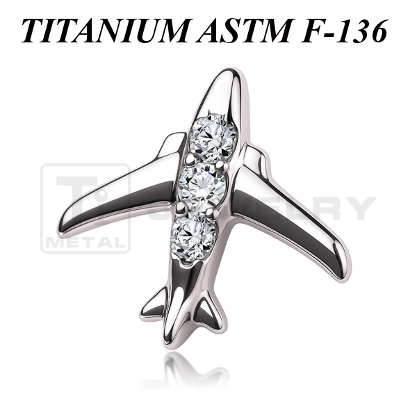 Накрутка из имплантационного титана 6Al-4V-Eli ASTM: F-136 в виде самолёта, украшена тремя прозрачными фианитами. Размер накрутки: 7,1х6мм.